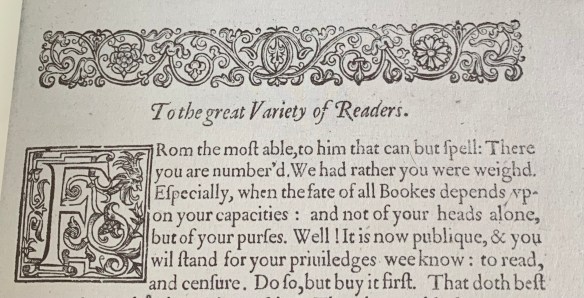 But turning again to anagrams in the First Folio of Mr. William Shakespeares [sic] Comedies, Histories & Tragedies, theater business partners, John Heminges and Henry Condell, address “The Great Variety of Readers,” as opposed to just “the Reader,” as Ben Jonson did in the same volume.