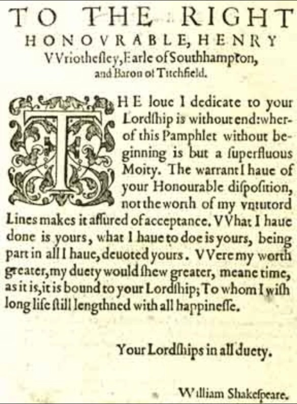 Let’s see what rich harvest Shake-Speare’s two Dedications to his then prospective son-in-law, Henry Wriothesley, yield. I’ll refer to the texts as originally published, but (neuer feare), a modern transcription follows at the vere end.