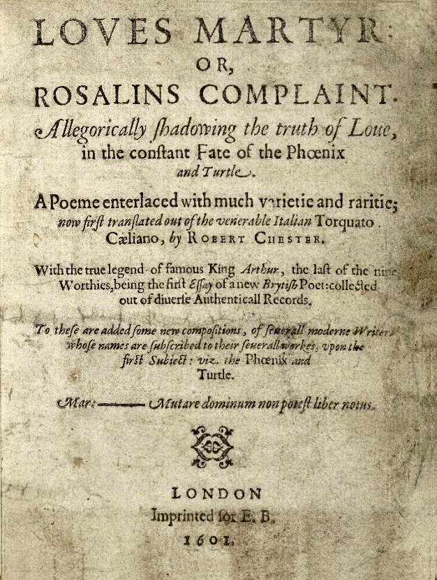 By introducing the character Threnos as“Chorus” about two-thirds intoThe Phoenix and the Turtle [as in Turtledove] (1601), the man who wrote Shakespeare wants to ensure we view his poem as a “threnody,” a lamentation for the dead.