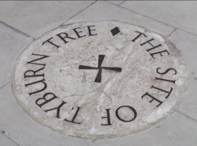 (R) Restored Plaque at the site of the Tyburn Tree Marble Arch. Source: Metro London.